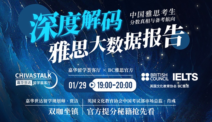 1月29日晚,嘉華留學“薈客廳”與英國文化教育協會(BC)雅思官方聯合推出的專題直播《雅思大數據報告深度解碼——中國考生的分數真相與備考航向》圓滿落幕。本次直播,雙平台累計覆蓋受眾超28萬,吸引了大量學生與家長在線參與,帶來了一場充滿啟發的“備考導航課”。